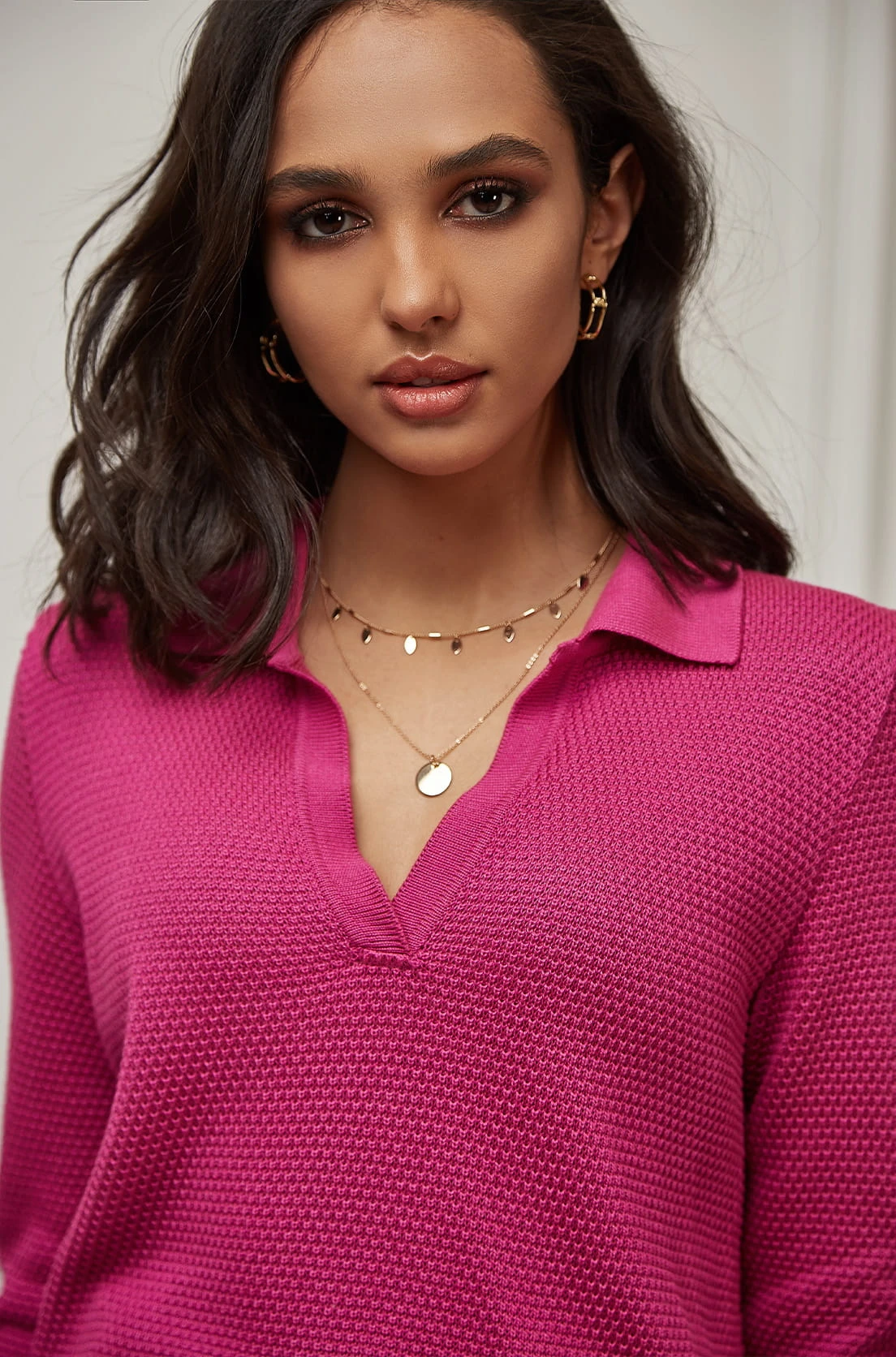 Ażurkowy sweter z wiskozy dostępny jest w dwóch pięknych nasyconych kolorach: malinowym różu oraz czerwonym. Dekolt w serek z dodatkowym kołnierzem koszulowym nadaje mu unikatowy charakter i elegancję. Ze względu na swój dobry skład, sweter charakteryzuje się miękkością, wytrzymałością i odpornością na zmechacenia.