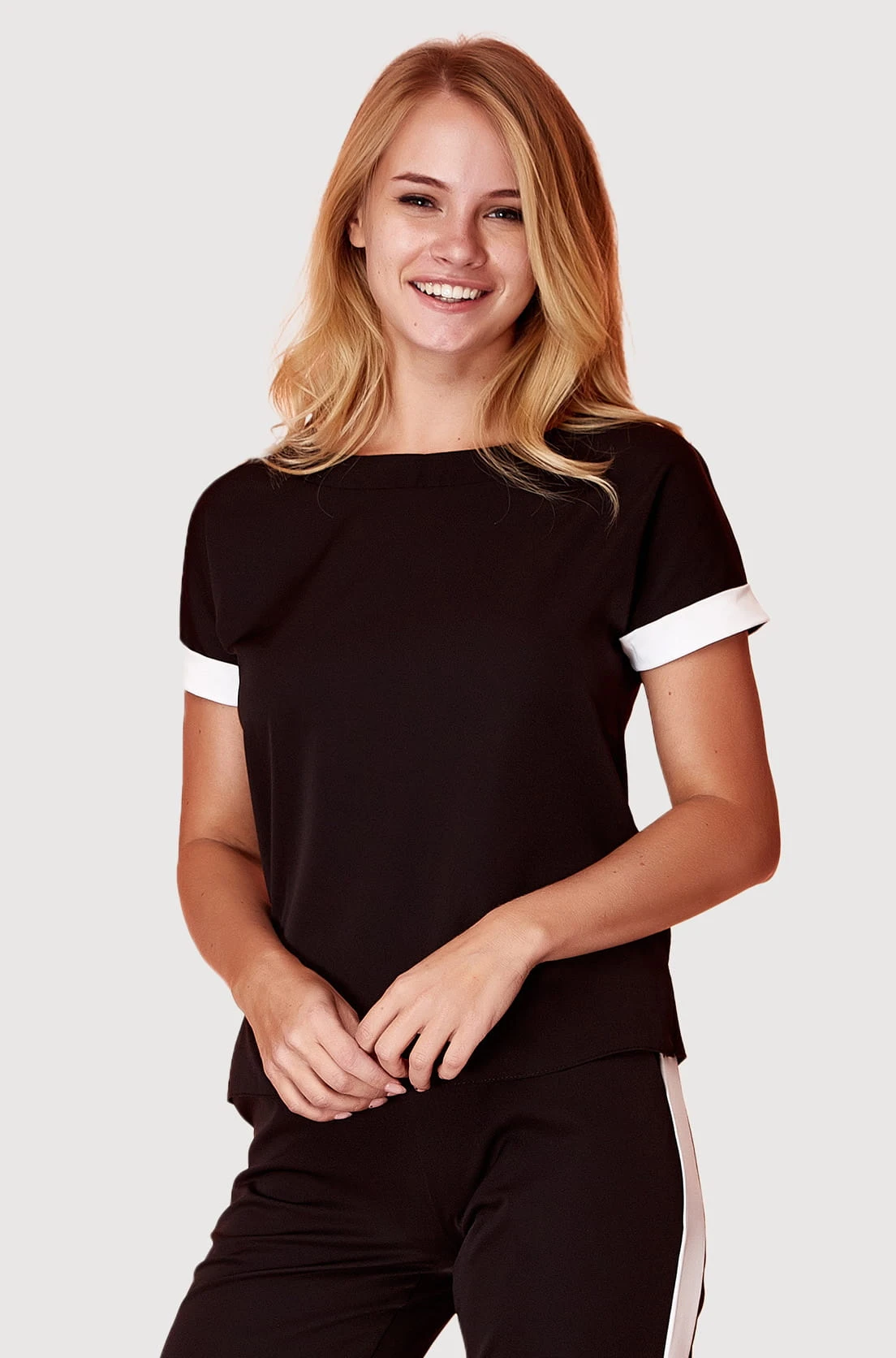 Dopasowany damski t-shirt w dwóch kolorach: biszkoptowym i czarnym.