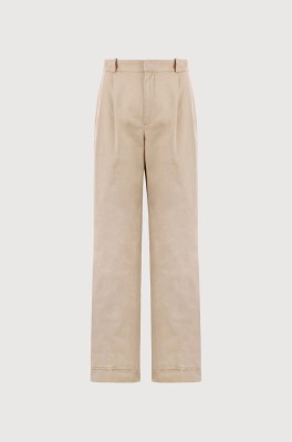 Damskie spodnie w kolorze piaskowym wykonane z wiskozy i lnu. Wyróżnia je: