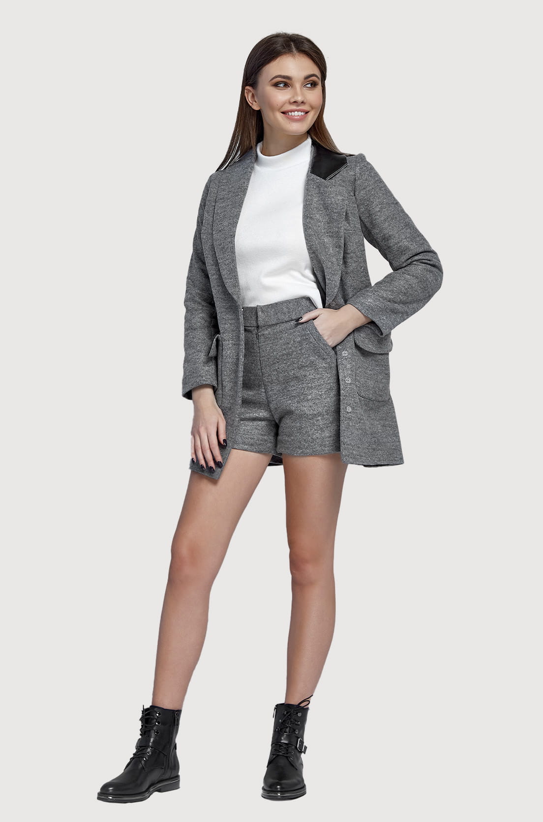 Eleganckie szorty wykonane z miękkiej mieszanki bawełny (80%) i wełny (20%). Idealne do noszenia w biurze, zwłaszcza w połączeniu z marynarką. Mają szary melanżowy kolor, który dodaje im elegancji. Zapinane na guzik i suwak, co zapewnia wygodę noszenia. Dodatkowo posiadają praktyczne kieszenie. To doskonała alternatywa dla długich spodni garniturowych w ciepłe dni.