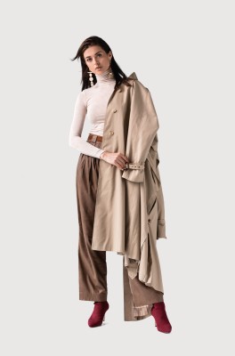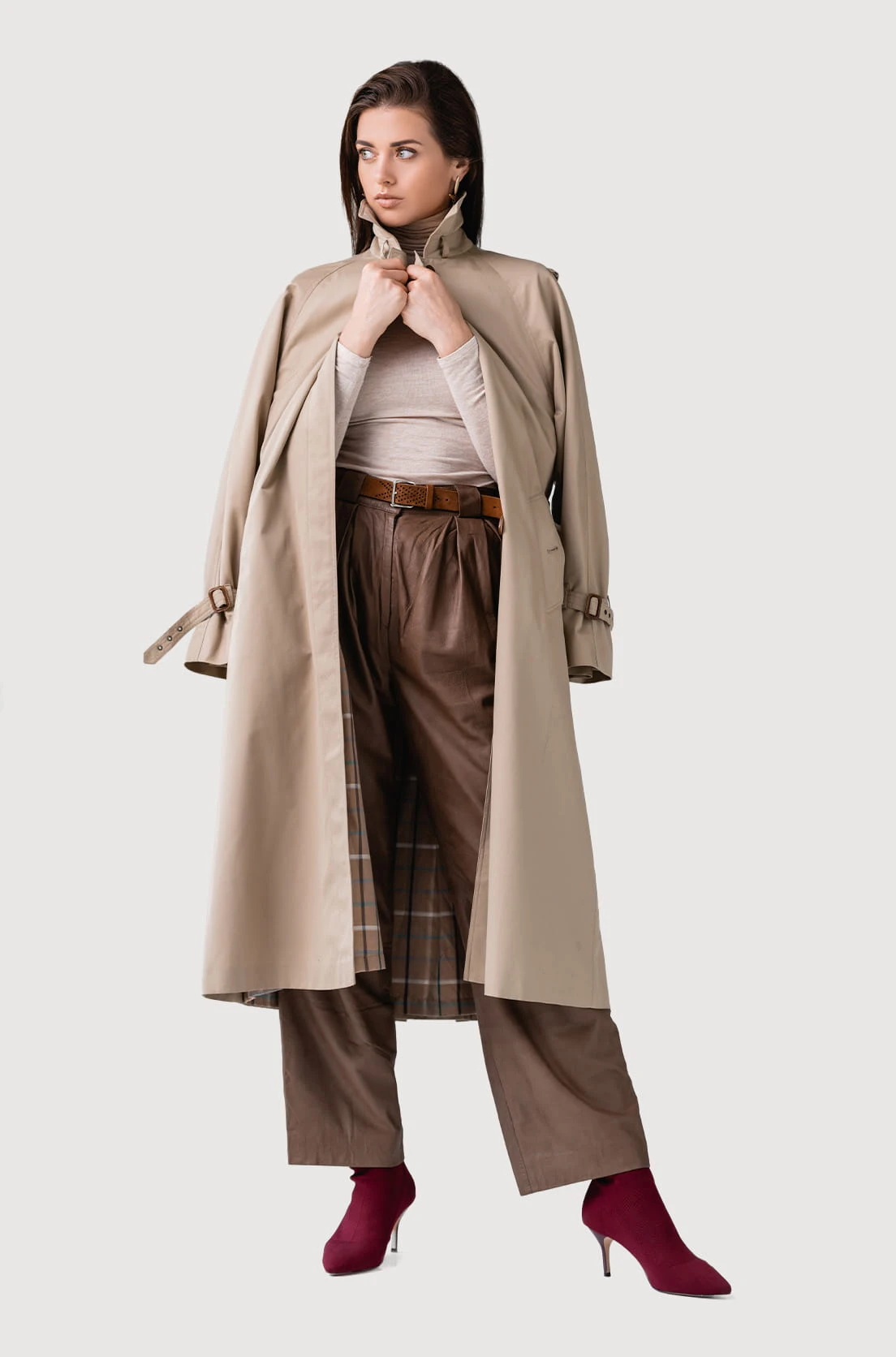 Charakterystyczny kołnierz stojący oraz guziki jako zapięcie nadają trenczowi eleganckiego wyglądu. Został wyposażony w praktyczne kieszenie, które pomieszczą telefon i inne niezbędne drobiazgi.